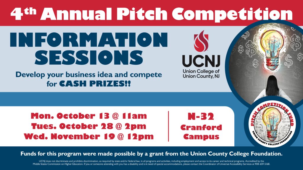 If you are interested in a chance to compete in the 4th Annual UCNJ Business Center Pitch Competition, join us for one of the following information sessions. During the information session, you will find out how you can earn a $500 stipend and how to bring your innovative business idea to life to compete for a cash prize (up to $6,000)!!! You do not have to sign up for the information session – just come to N32 on any of the dates listed below.