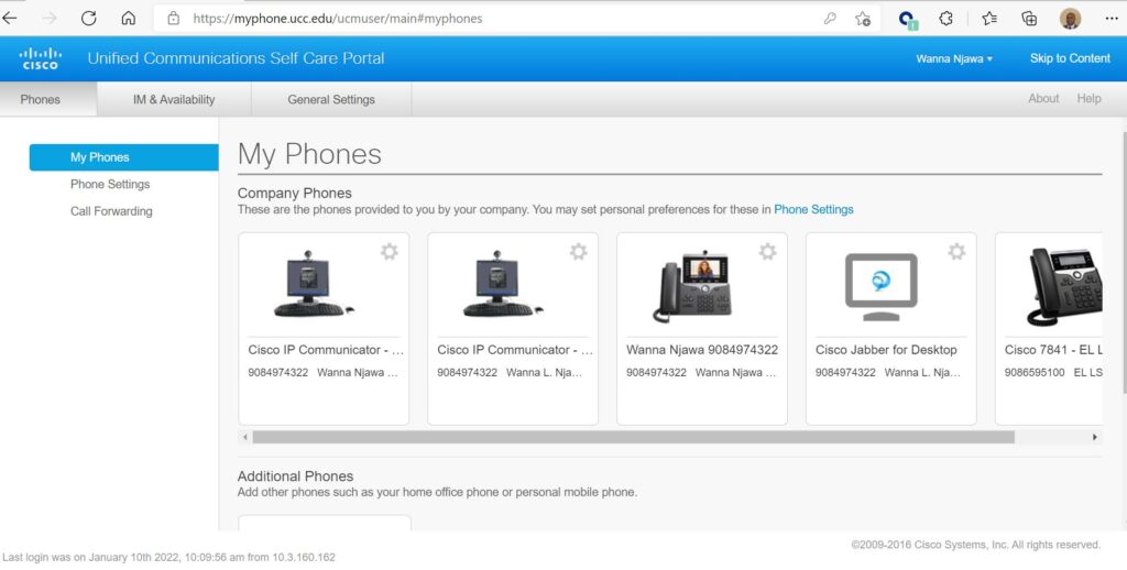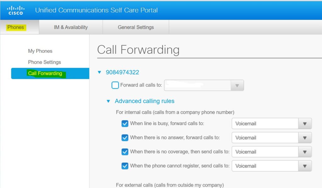 From Unified Communications Self Care Portal, choose Phones and click Call Forwarding.