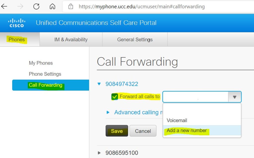 To forward calls to another phone number, check the Forward all calls to: check box, choose Add a New Number from the drop-down list and enter the phone number in the field and Save.