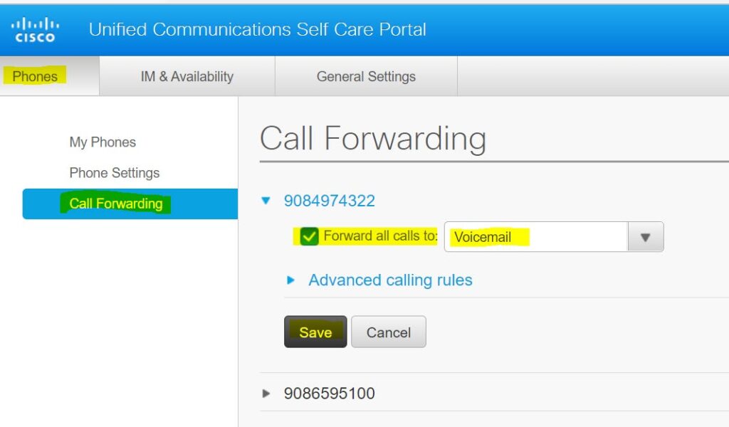 To remove call forwarding, uncheck the Forward all calls to: check box and Save.