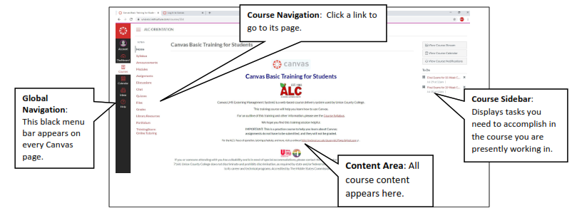 Canvas LMS (Learning Management System) is the web-based application Union County College uses for courses. This help sheet presents an overview of the Dashboard and the course home page.