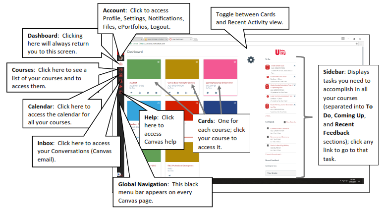 Dashboard: The Dashboard opens when you log in to Canvas.
