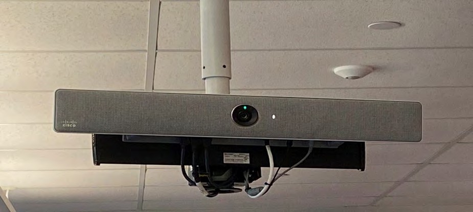 - There will be an additional monitor on the desk where you will be able to see the participants and see what is being shared. In order to change the view of participants to “grid view”, first click on the view icon.