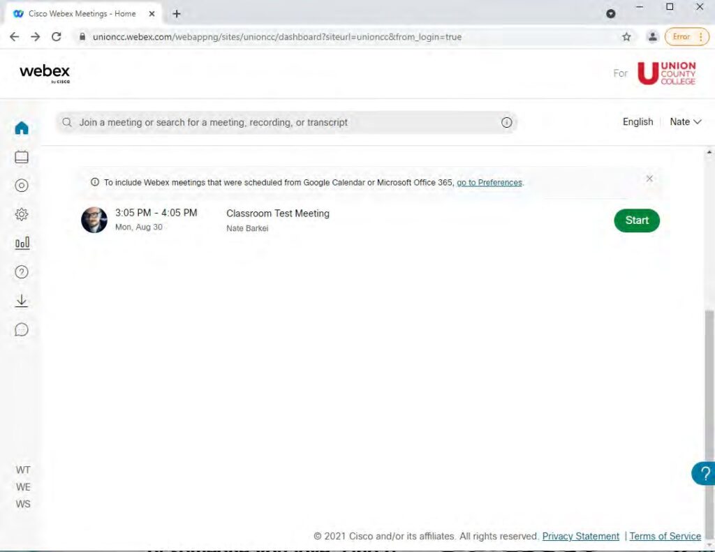 - After logging into the computer in the room open a browser and go to unioncc.webex.com and log in.