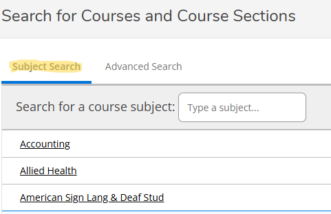 The current default tab is Subject Search. The Advanced Search tab guidance will follow the Subject Search guidance.
