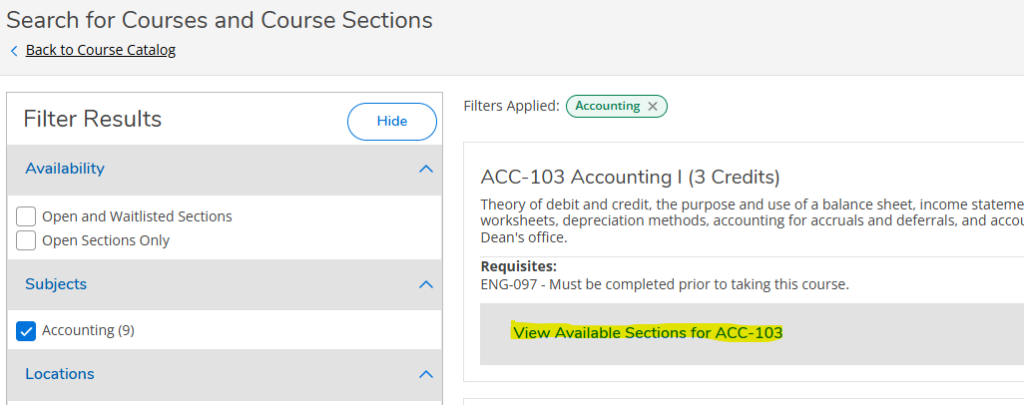 A list of courses for the subject selected is displayed on the right. From here you can select additional filters from the options on the left. Each time you add an additional filter, the results on the right reflect those selections. NOTE: Only terms that are open for registration will be available in Subject Search.