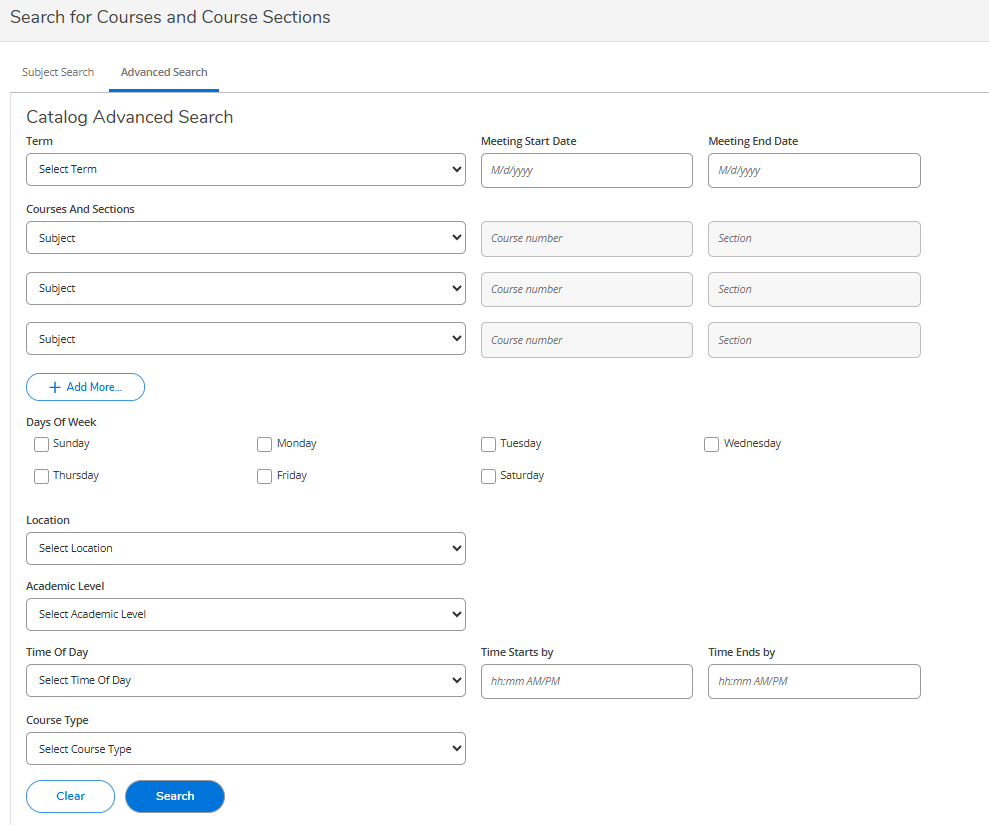 The Advanced Search is very much like the Search for Sections page in Web Services. Selection criteria is self-explanatory. After entering the search criteria, click the blue Search button at the bottom of the page. NOTE: The available terms for selection are set by the Registrar’s office.
